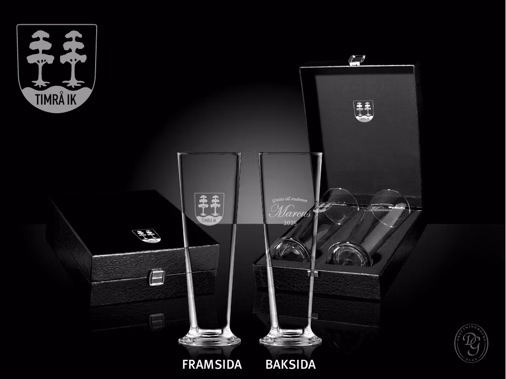 Fira studenten med stil! Lägg till personlig gravyr för en unik studentpresent.Två snygga höga allglas prydda med Timrå IK:s logga – perfekt för att skåla in fr