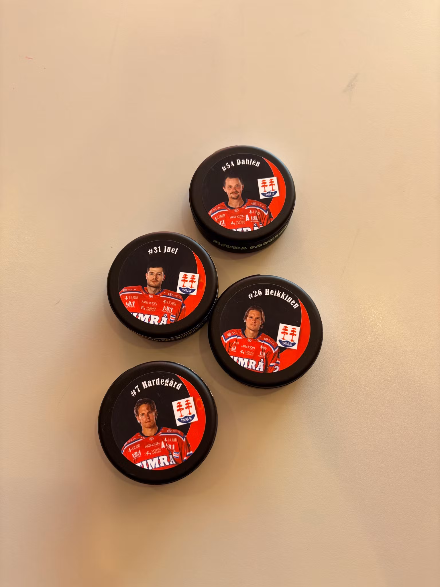 Puckar i plast med olika smaker och olika spelare.